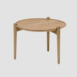 The Aria coffee tables by Design House Stockholm have a lightness and understated style. The solid oak legs and the tabletop seem to be separated; the circular tabletop suspended.