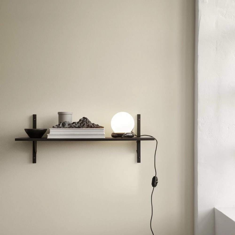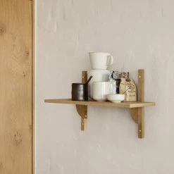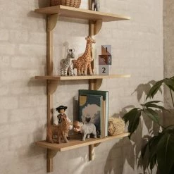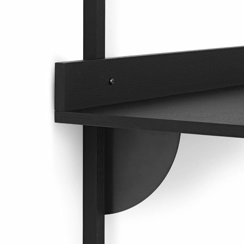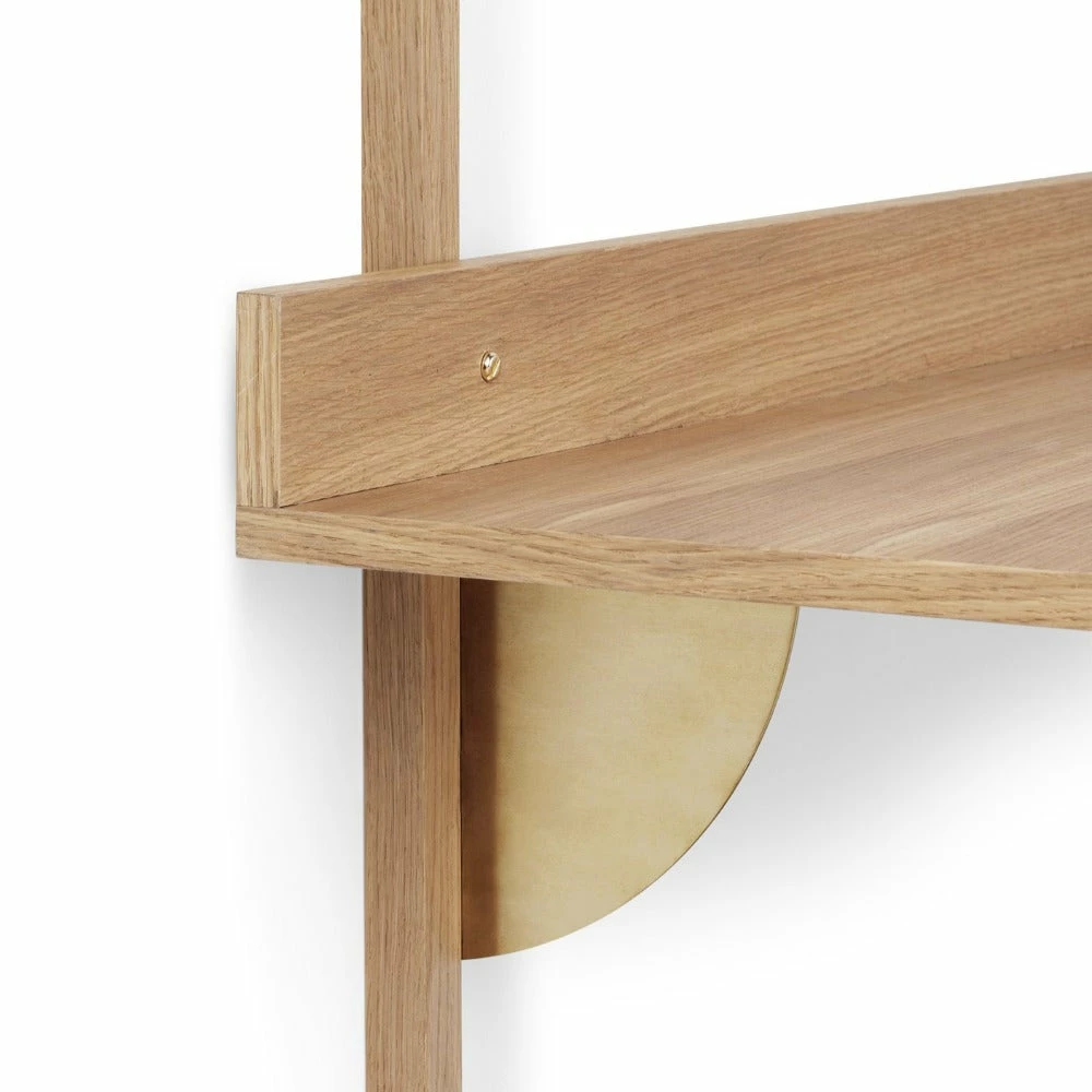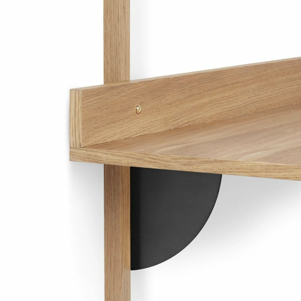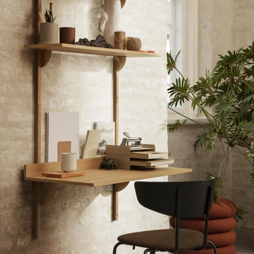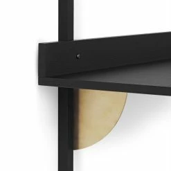 Choose between black ash or oak veneer desktop with black brass or brass brackets. Each shelf can hold up to 20kg when fitted properly.