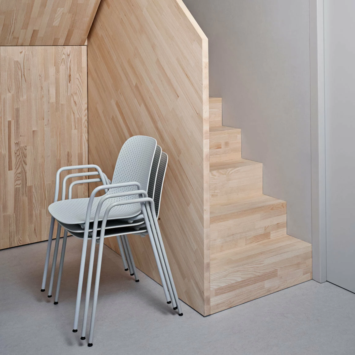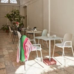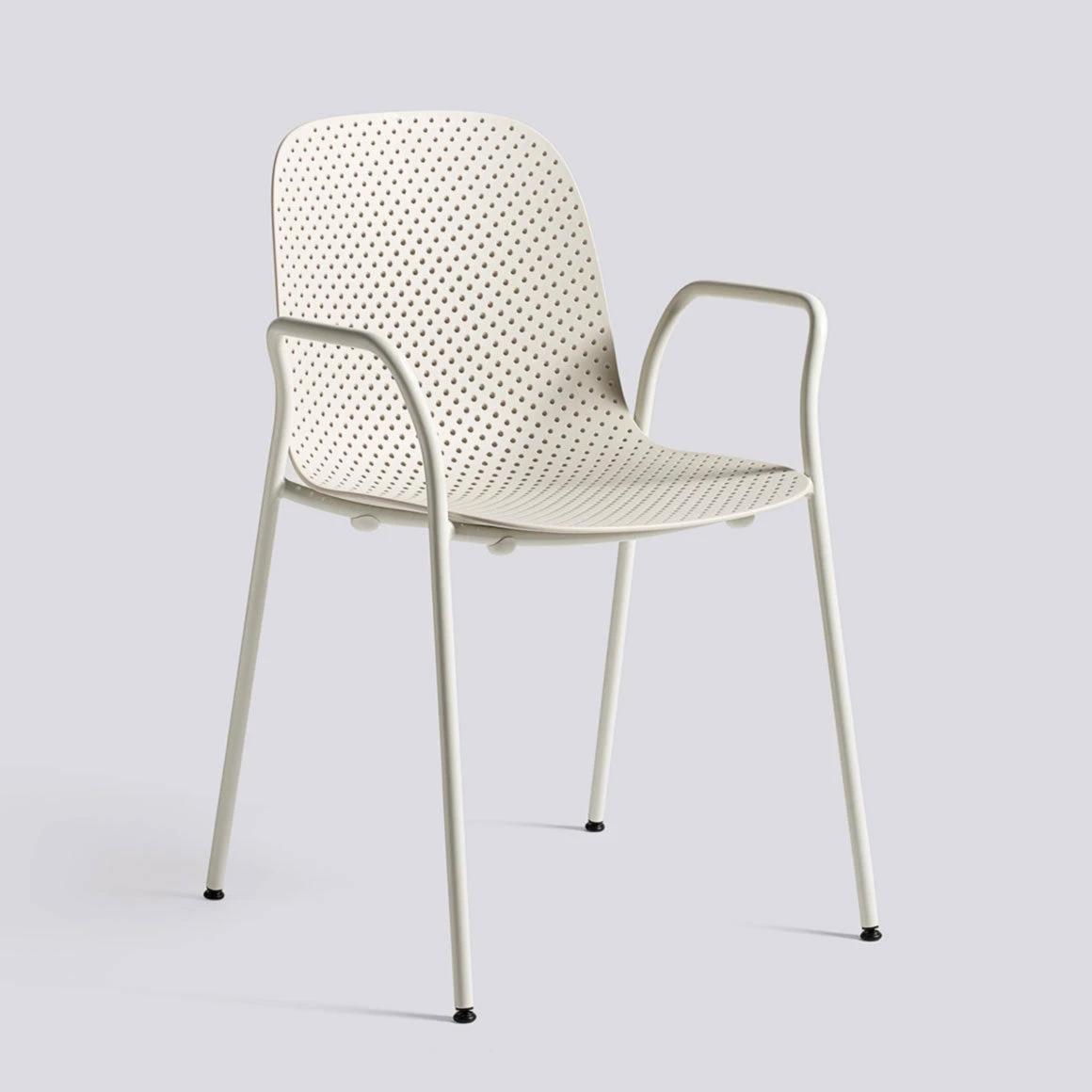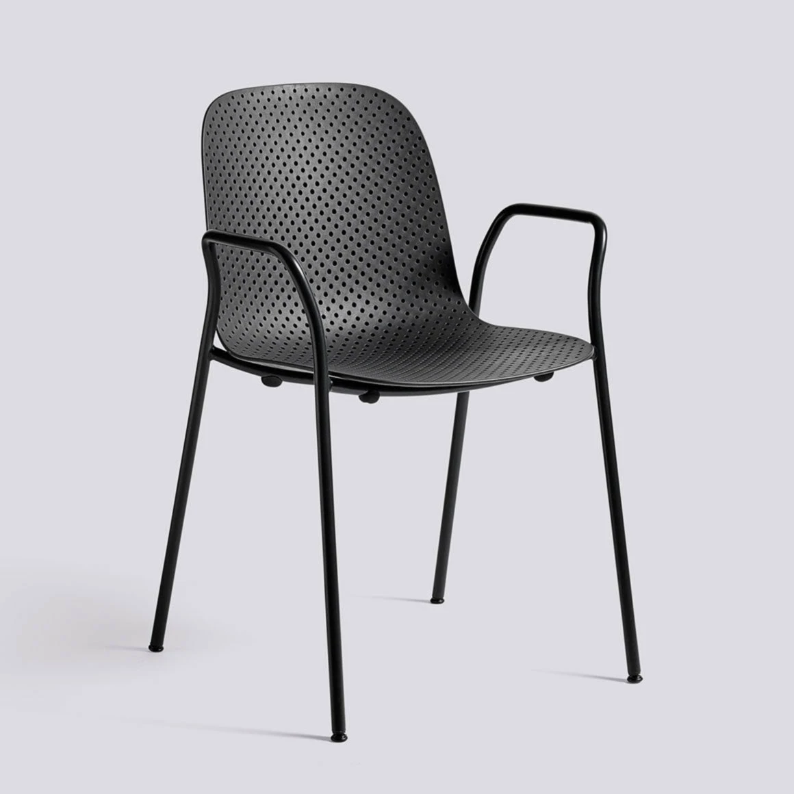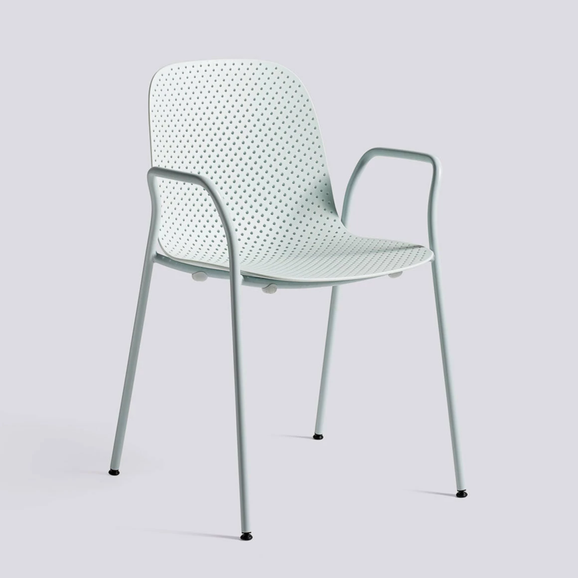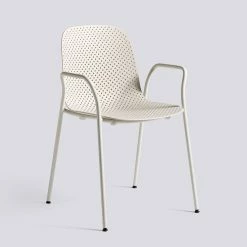 The 13eighty Arm Chair is aptly named after the number of tiny holes in the moulded polypropylene seat. These perforations create a playful characteristic and a sense of movement to the chair. They also have a function in draining rainwater off when the chairs are used outdoors. Stackable.