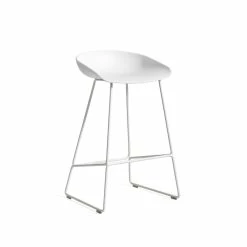A curvy comfy polypropylene seat on top of an elegant rounded frame in powder coated metal, with a more industrial design than the wooden counterpart. Ideal for informal dining at kitchen countertops.