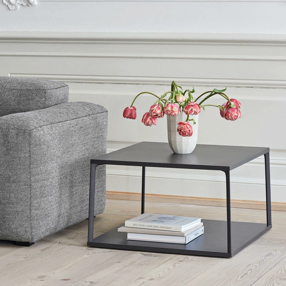 Cast aluminium legs with powder-coated MDF shelves in ink black.