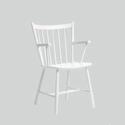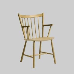 The J42 chair has simple horizontal and vertical lines which are used to construct a curved spindled backrest and angular armrests.