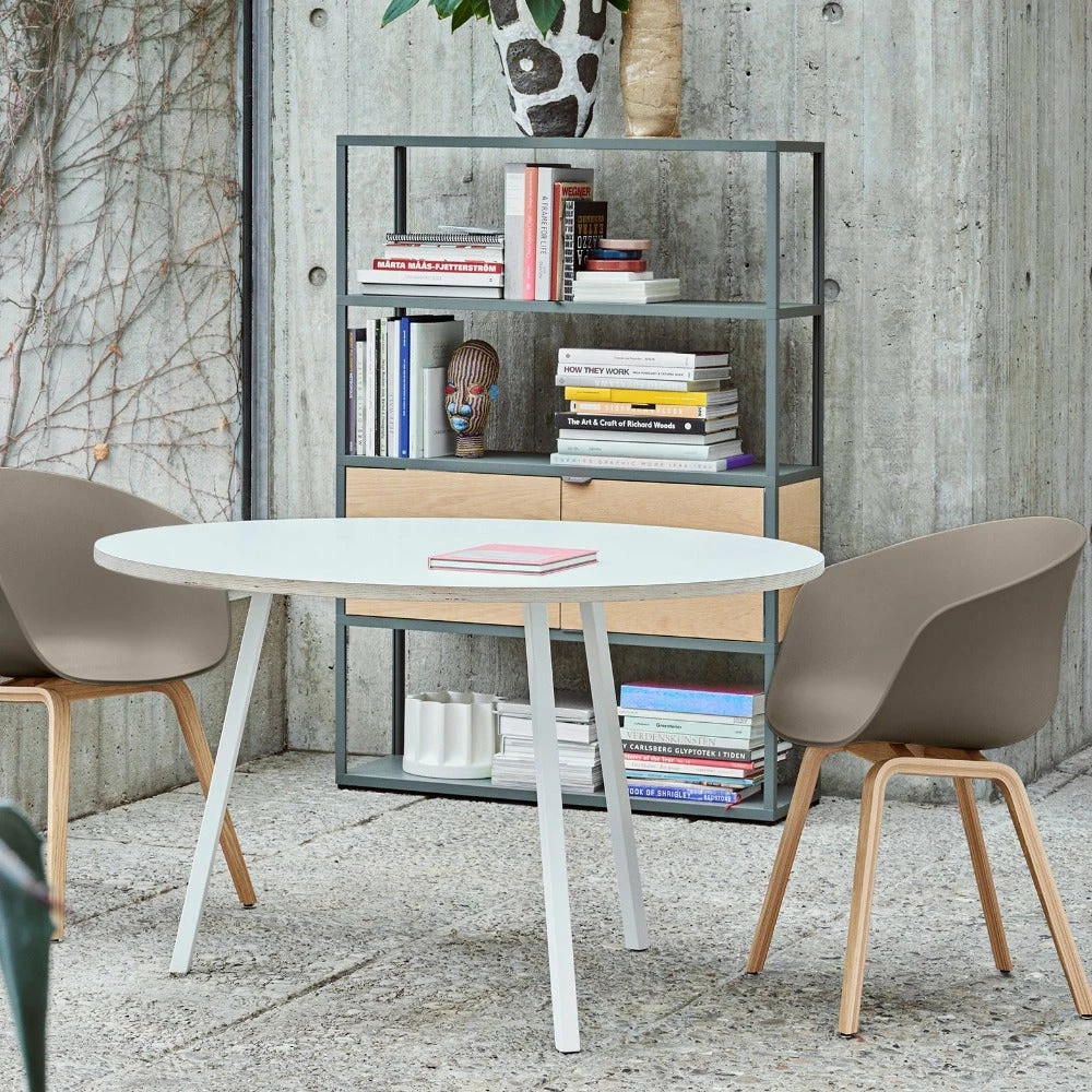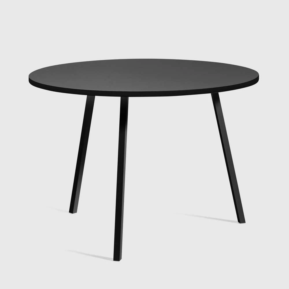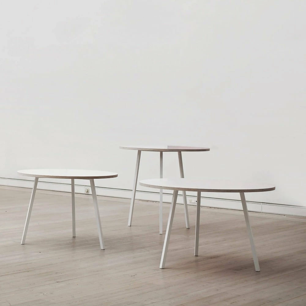 The laminated plywood top sits on three angled legs. The white version has an exposed plywood edge to the tabletop. The black version has a black stained ash veneer edge.Â