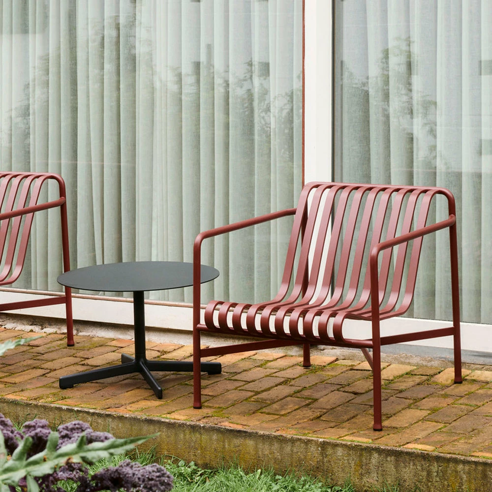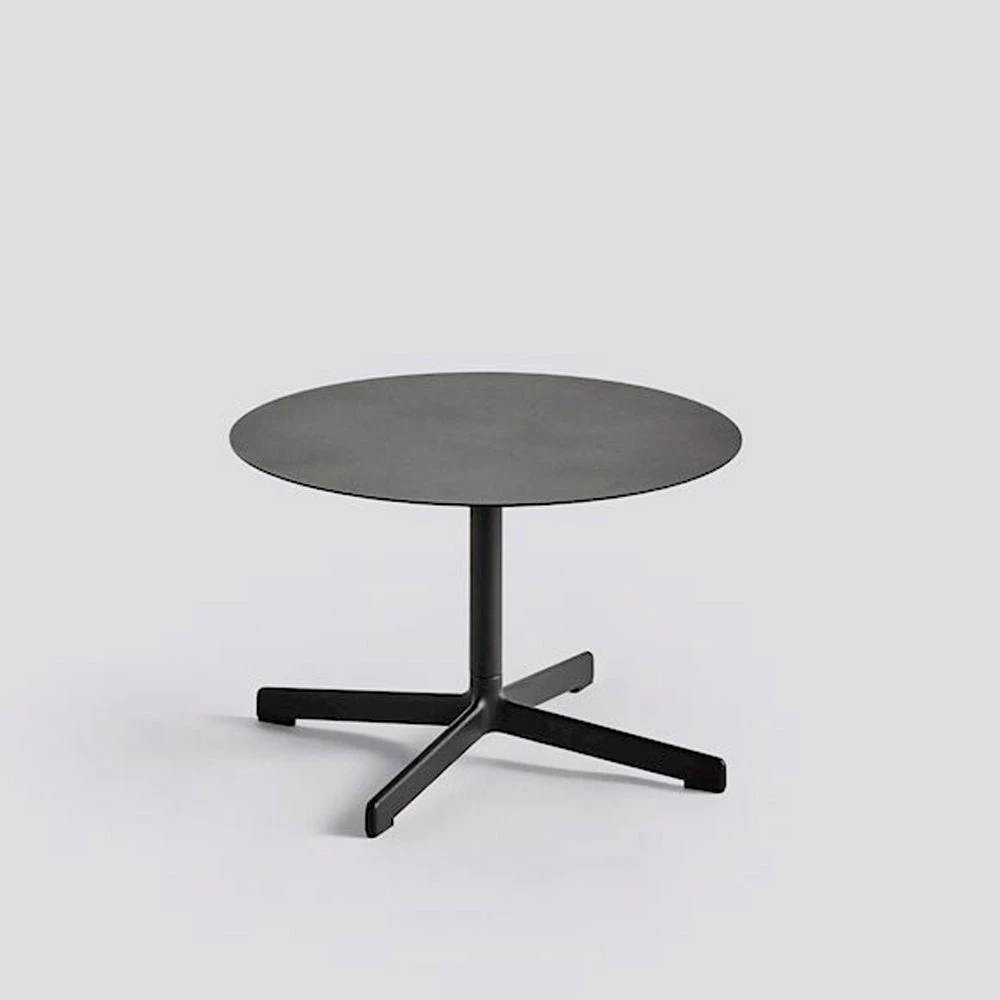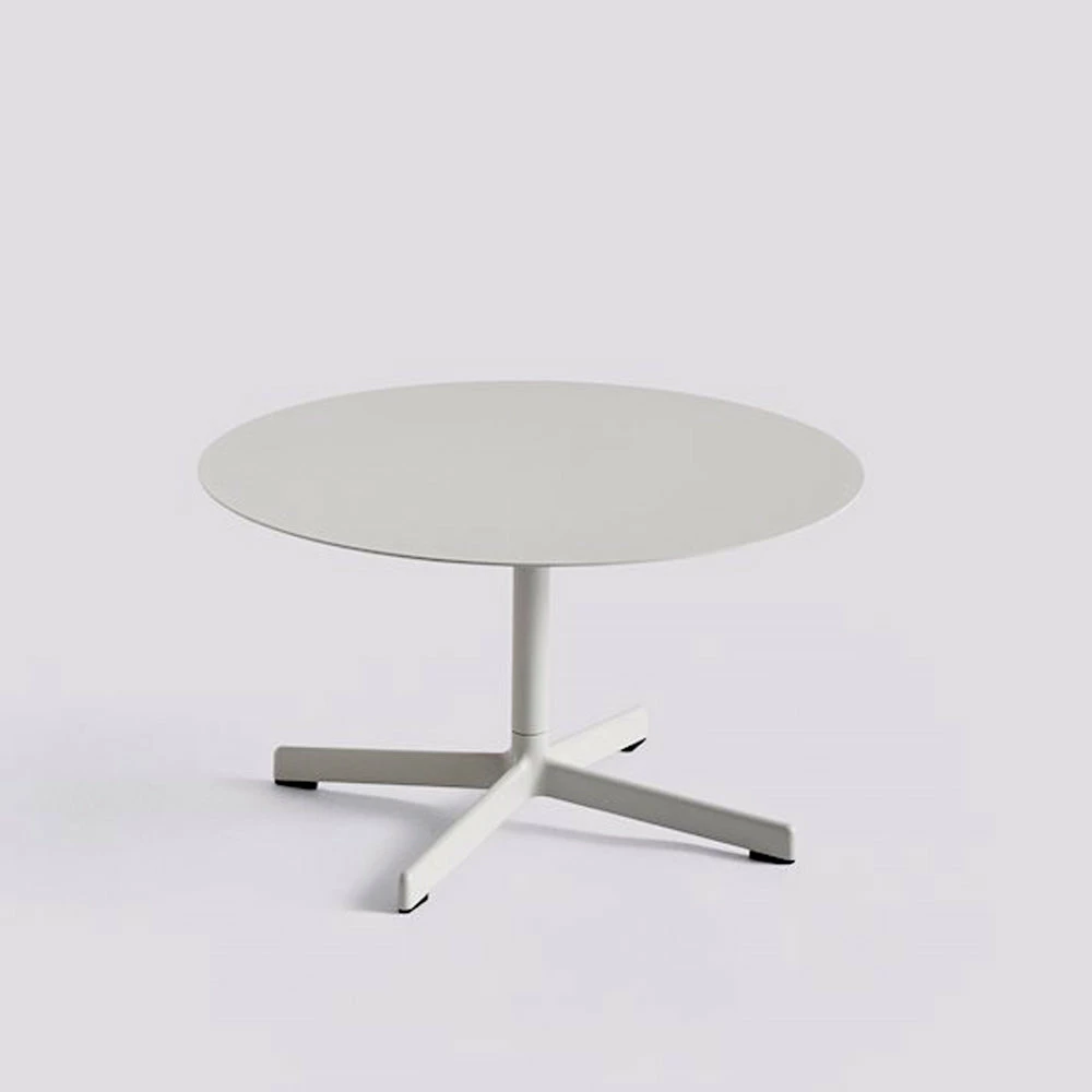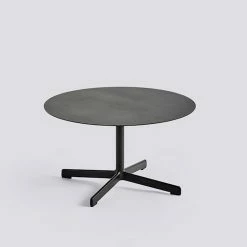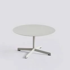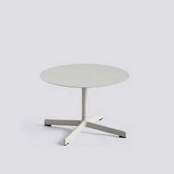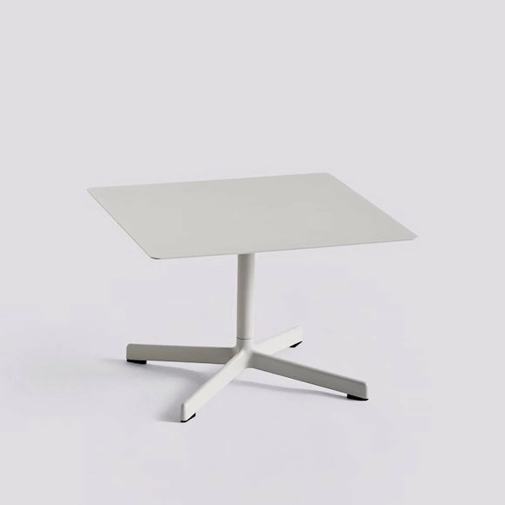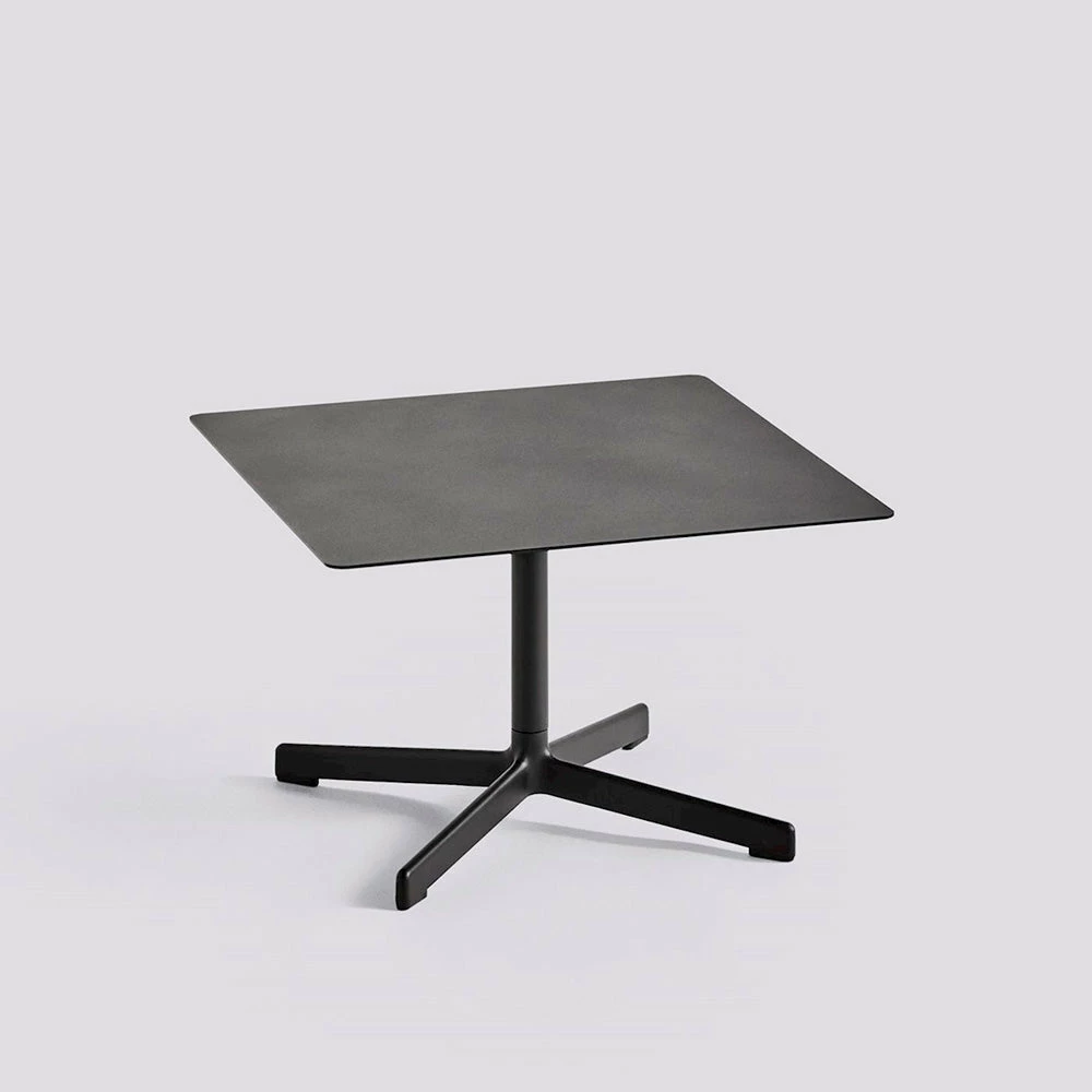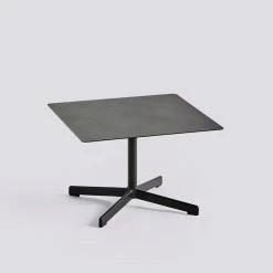 The Neu Low Table features a small round or square tabletop attached to a short central pole and angled 4-star pedestal base.