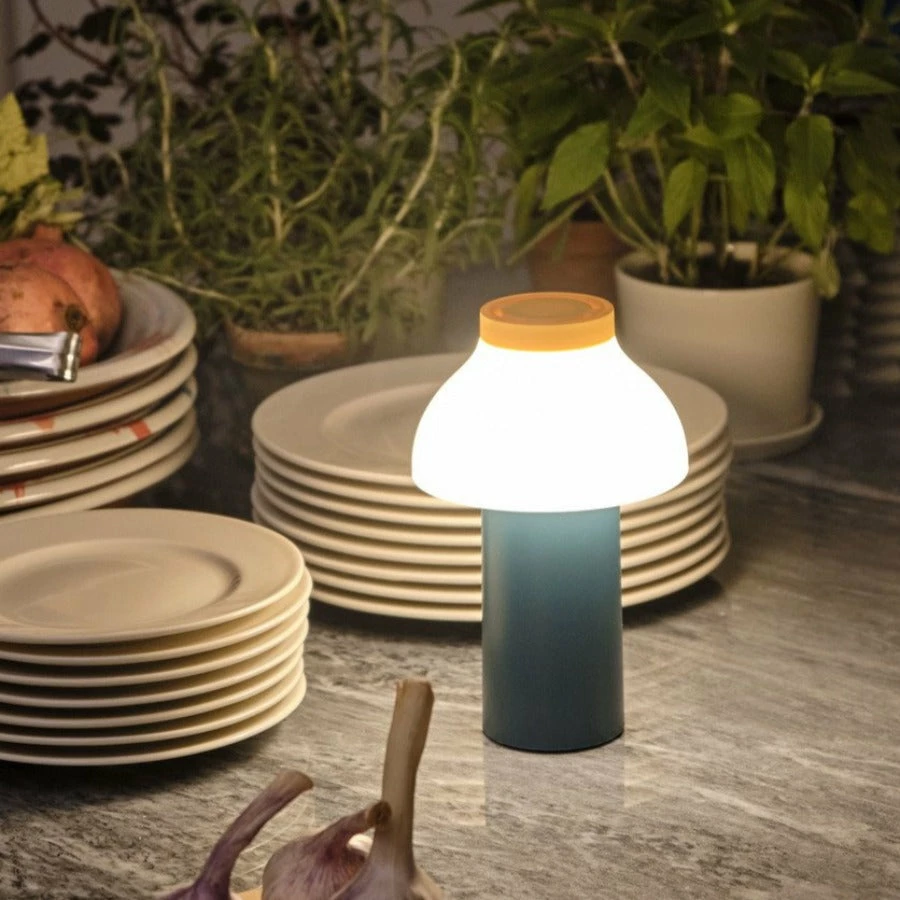 Pierre Charpin’s PC Portable Lamp by Hay is a portable freestanding lamp for indoor and outdoor use. Its hidden light source casts an ambient light at three different brightness settings.