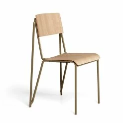 Using die-cast aluminium and steel tubes that connect into a three-dimensional triangle, the lightweight frame has a distinctively geometric silhouette, which is counterbalanced by the warmth and natural quality of the oak-veneer seat and backrest.Â