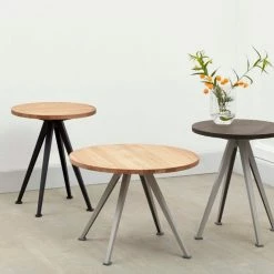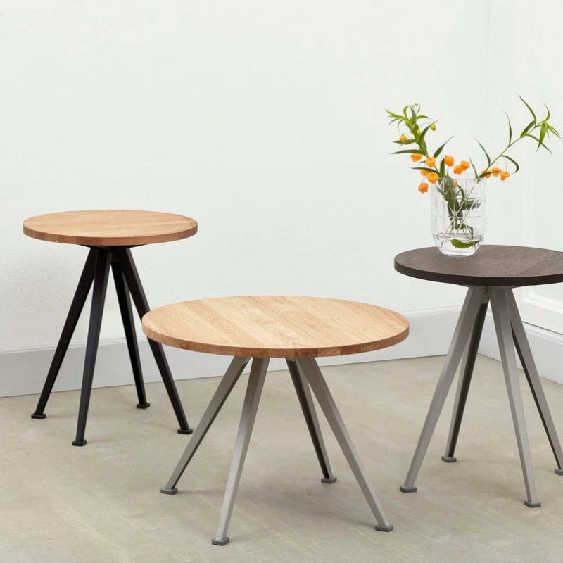 Designed to be functional, light and strong, the Pyramid Coffee Table features a round oak tabletop and thin sheet-steel legs that slant outwards.