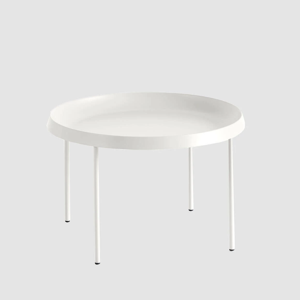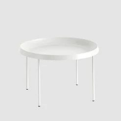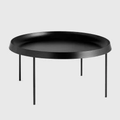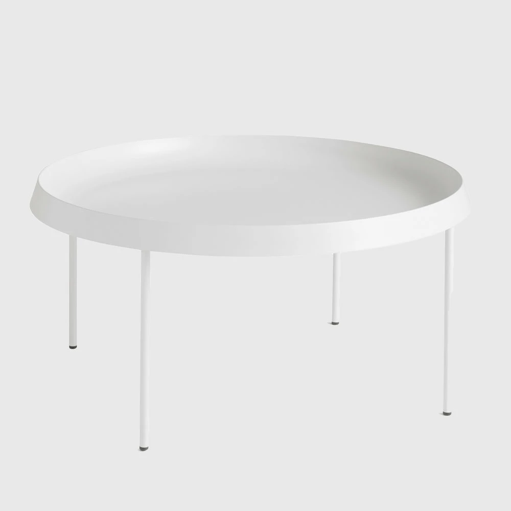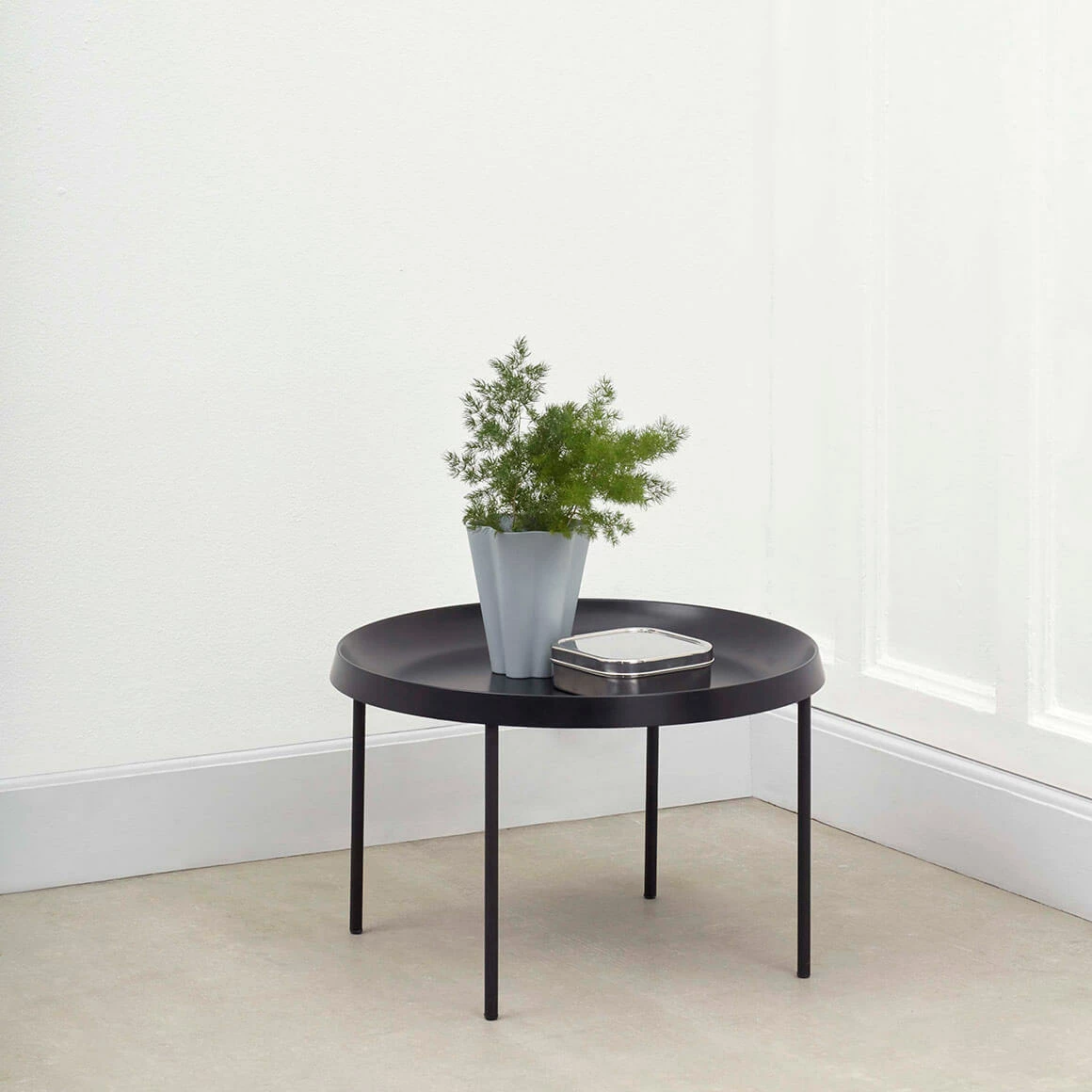 An updated version of a traditional tray table, the Tulou Coffee Table is made up of two elements – a spun steel round tray with an easy to hold edge and a four legged tubular steel frame.