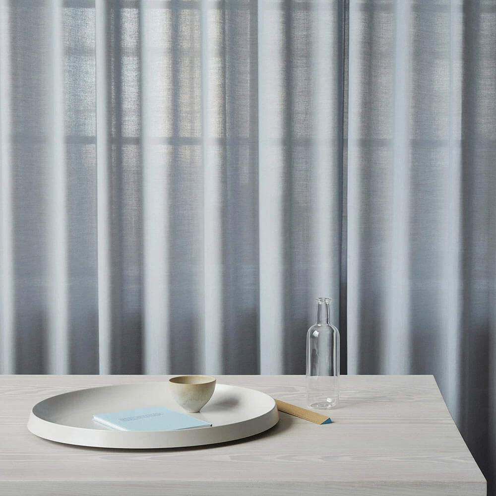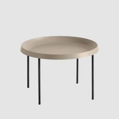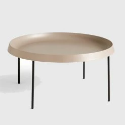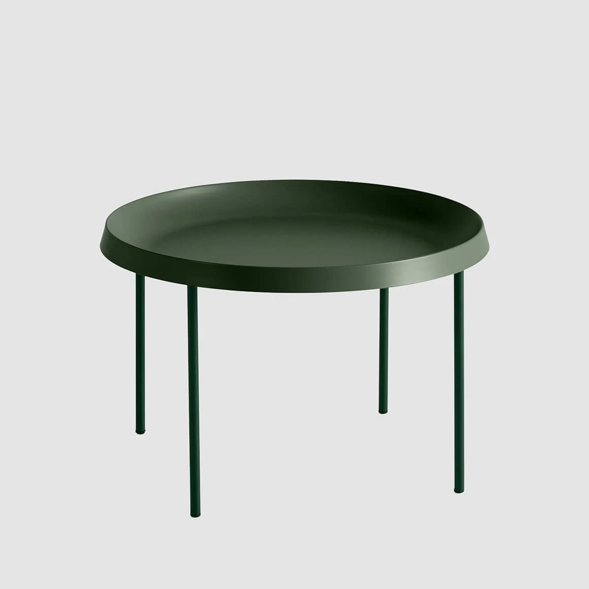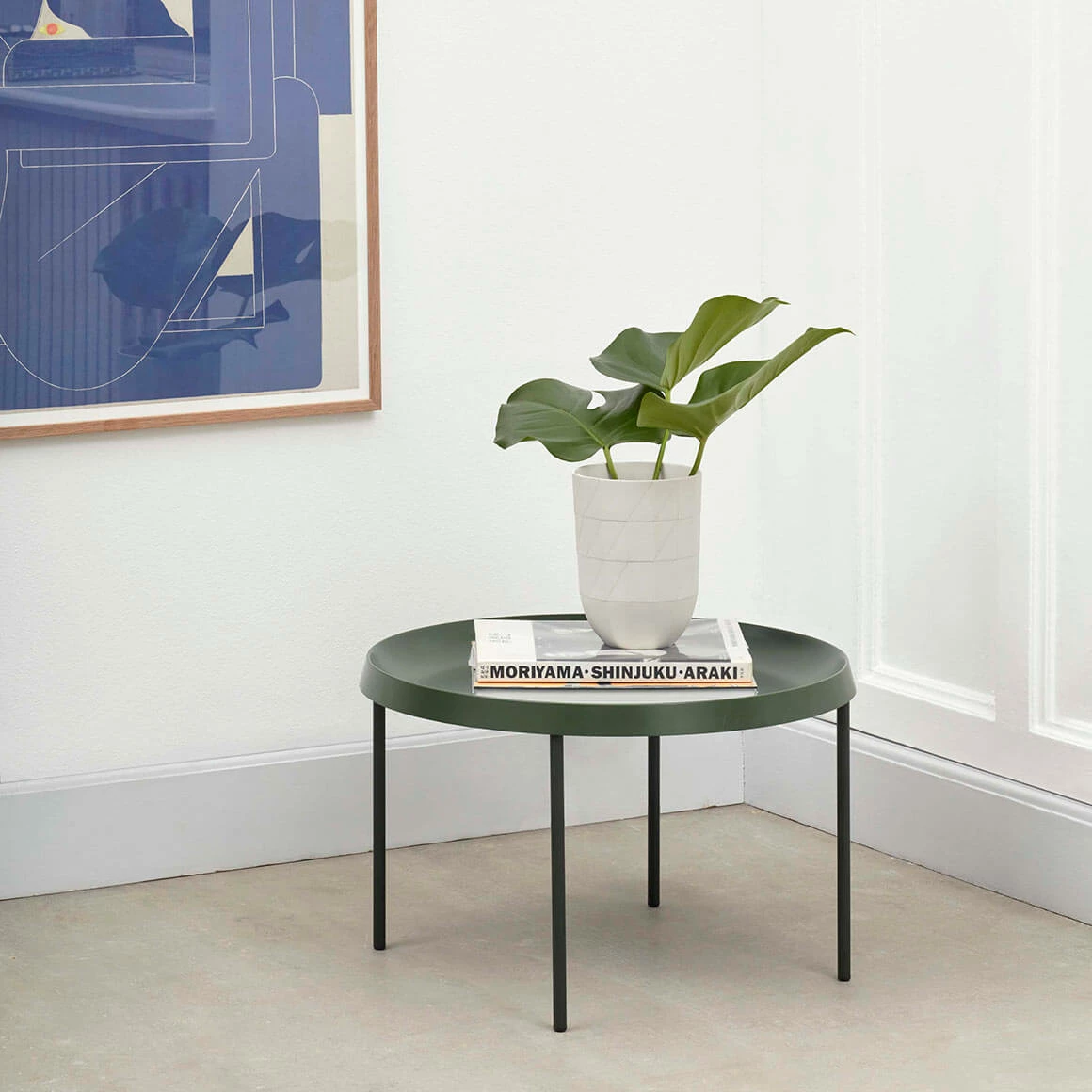 An updated version of a traditional tray table, the Tulou Coffee Table is made up of two elements – a spun steel round tray with an easy to hold edge and a four legged tubular steel frame.