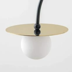This modern wall light by Houseof features an overreaching powder-coated metal frame, finished off with an opal glass shade, brass disk, and metal ball detail. Perfect for styling over your sofa to create a warm corner in the living room.