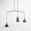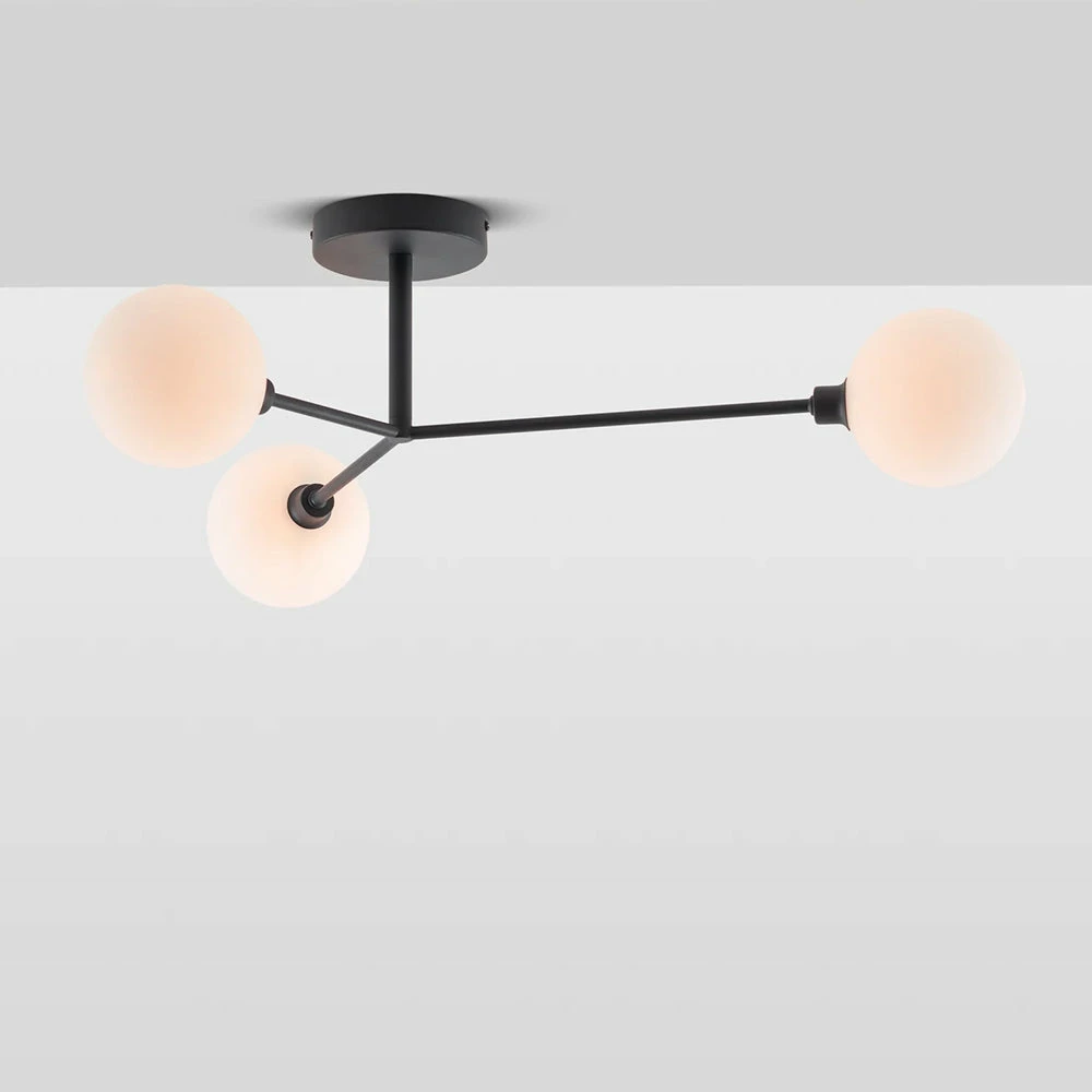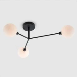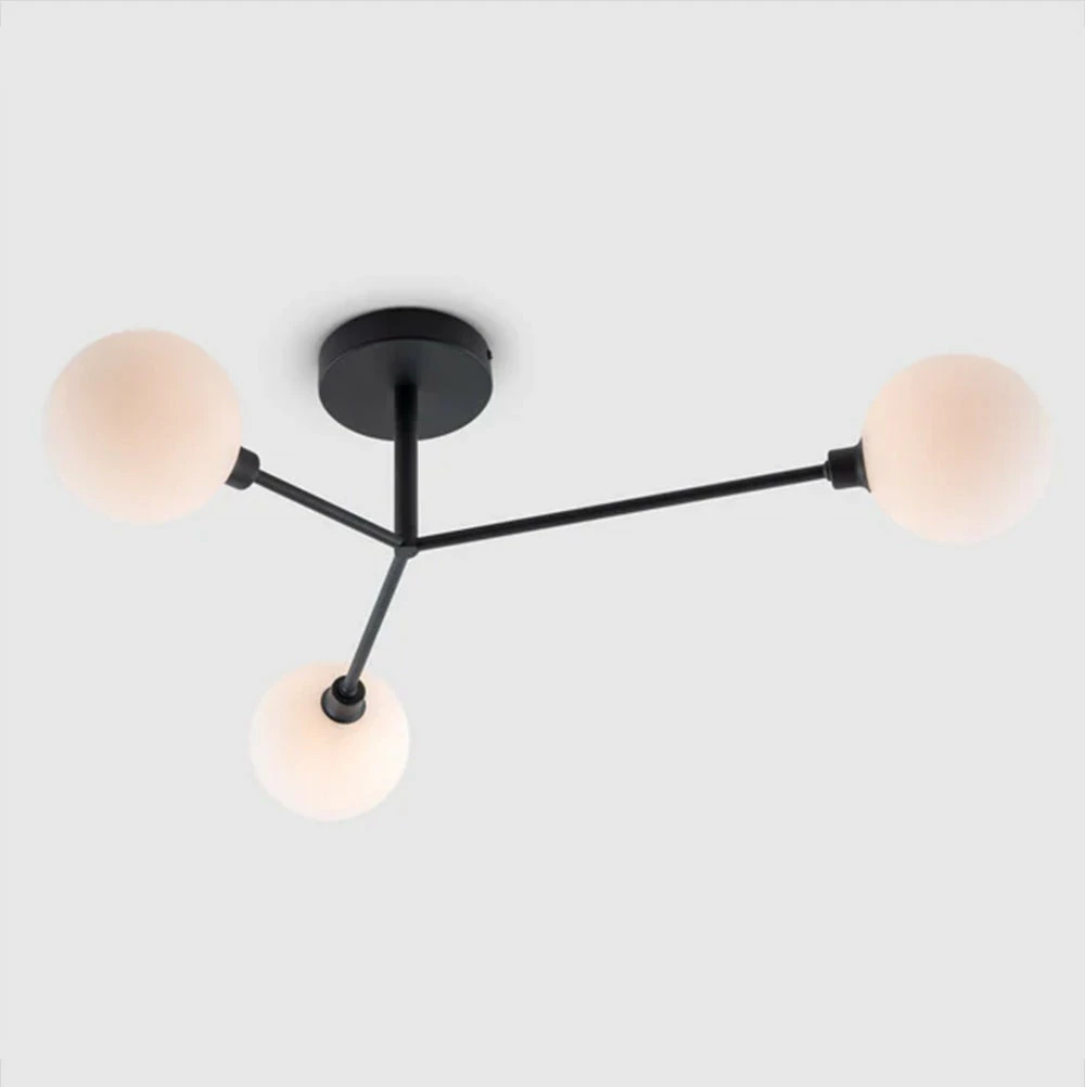 This ceiling light by Houseof embraces makes a modern statement, with three charcoal grey metal stems each suspending a milky-white opal shade — a striking contrast.