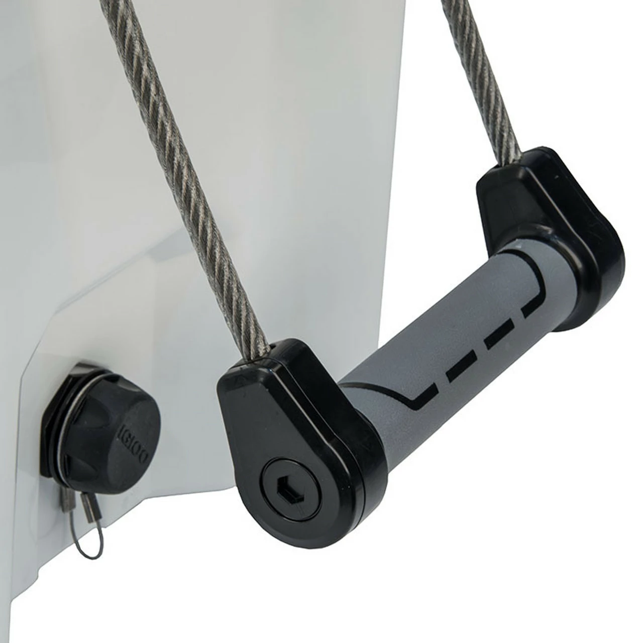 The Igloo IMX 70 cool box includes a multitude of features including an integrated stainless steel bottle opener, cup holders, anti-skid feet, a lockable lid, molded side handles, rubber lid gasket, steel braided swing-up cable handles, tie-down points, self-stopping lid hinges, marine-grade rubberized lid latches, threaded drain plug, a removable wire basket to keep items cold and dry. The IMX 70 cool box also features a fish measuring ruler!