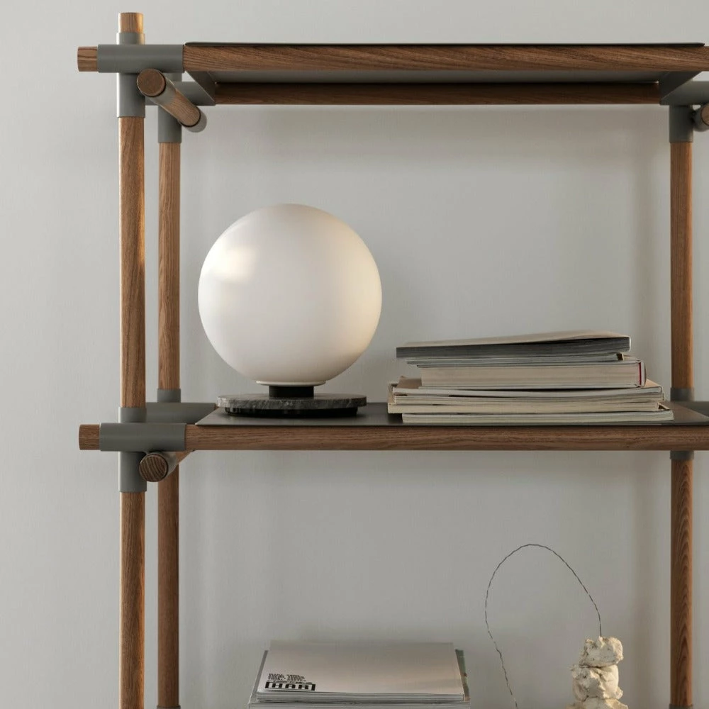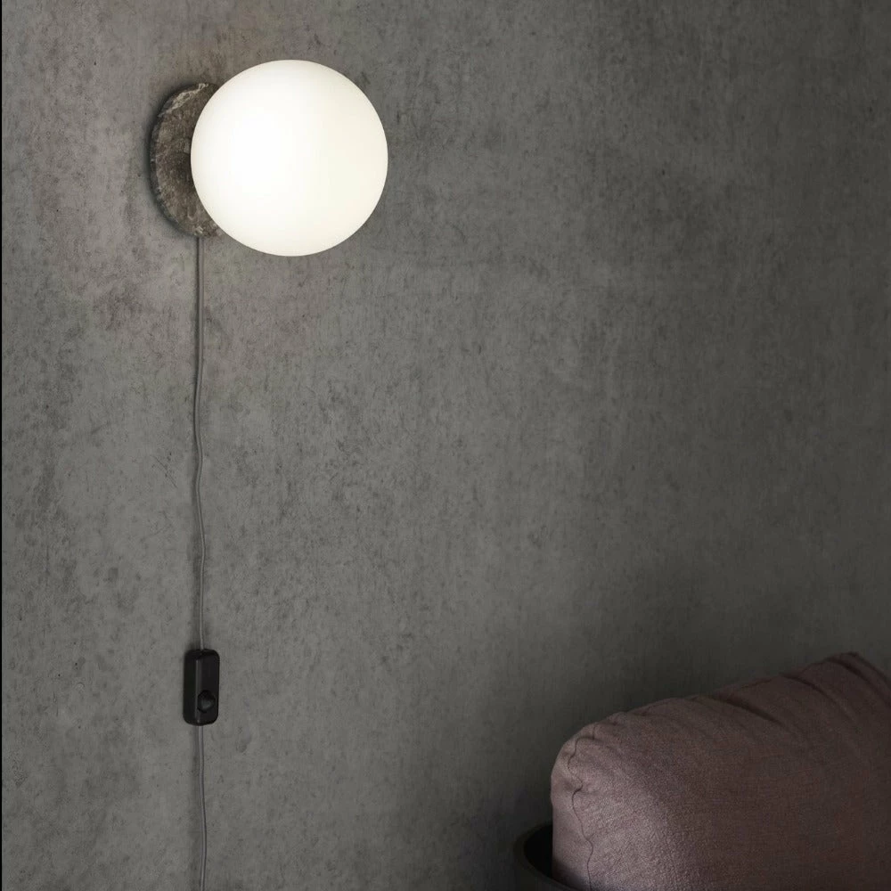 Black powder coated steel lamp with circular Ocean Grey Marble base or brushed brass. Opal glass bulb.