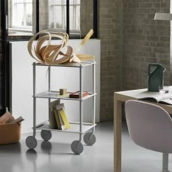 The Flow Trolley is a modern functional piece of playful storage furniture…  grooved trays in embossed metal paired with the flexibility of its wheels which allow it to be moved from one room to another.