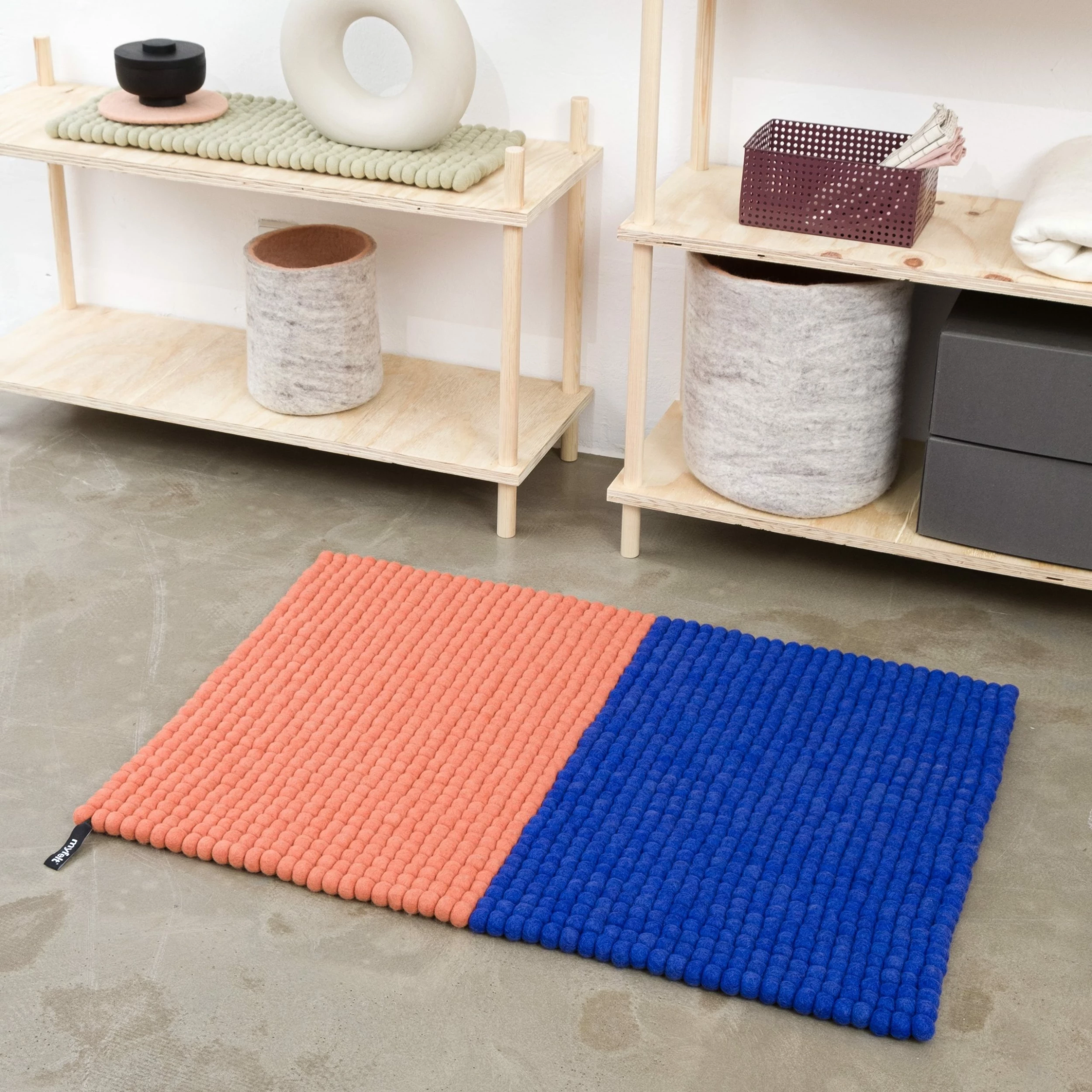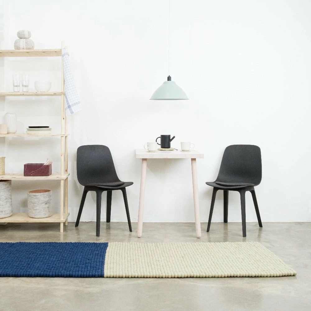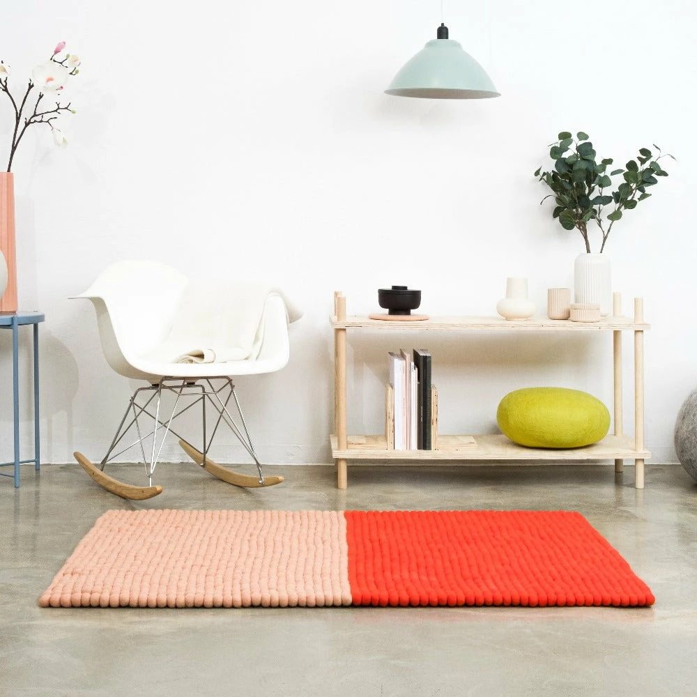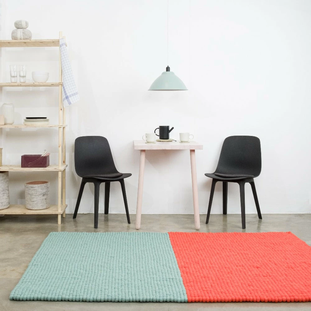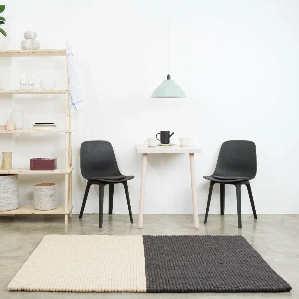 A modern minimalist rug made up of two contrasting colours. The felt balls gives it a soft tactile feel ideal for a living space.Â