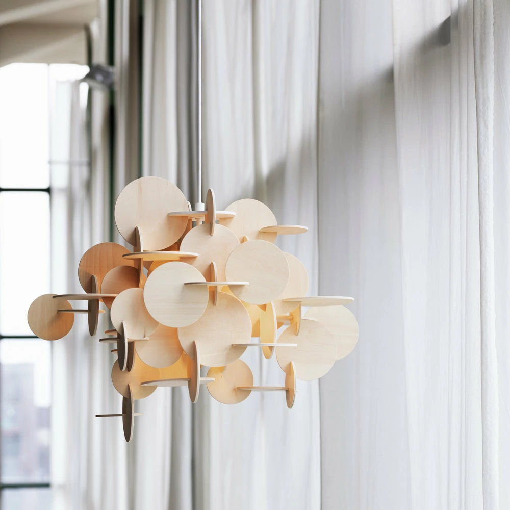 The Bau Pendant is made up of interlocking circular pinewood discs which you put together yourself to create a simple but sculptural piece of lighting.