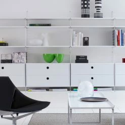 String is a modular and adaptable shelving system, designed by Swedish architect Nils Strinning in 1949. It became an instant classic thanks to its affordable pricing, flexibility and minimal aesthetic. It works as a shelving, work and storage solution and provides an unlimited number of layouts that can be quickly and easily changed.