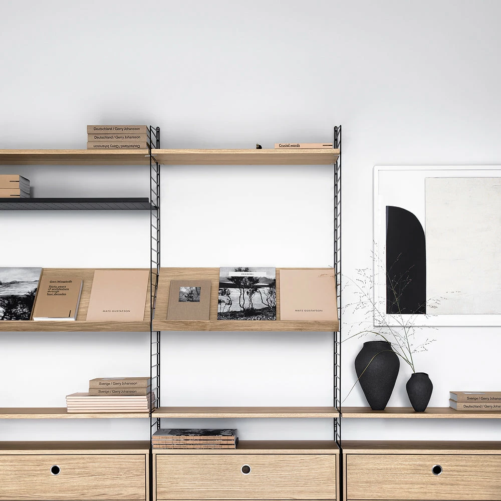 String is a modular and adaptable shelving system, designed by Swedish architect Nils Strinning in 1949. It became an instant classic thanks to its affordable pricing, flexibility and minimal aesthetic. It works as a shelving, work and storage solution and provides an unlimited number of layouts that can be quickly and easily changed.