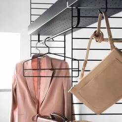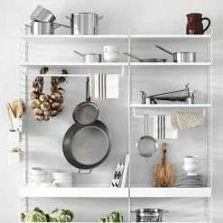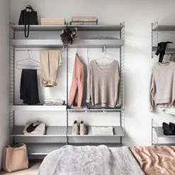 String + consists of a series of metal components including hooks and hangers ideal for hanging from the side panels and metal shelves. All ideal for creating bespoke wardrobe or hallway hanging systems as well as kitchen storage.