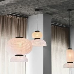 The pendant series is comprised of three different lantern versions in ivory white rice paper with black stained oak accents. They all come complete with a black 4 metre cable and bulb canopy.